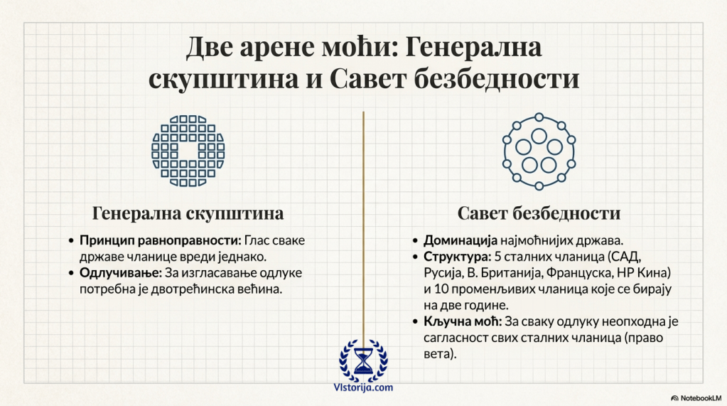 Државе чланице су равноправне у оквиру Генералне скупштине УН, у којој глас сваке државе чланице вреди једнако. За изгласавање одлуке је потребна двотрећинска већина. Најмоћније државе чланице доминирају у оквиру Савета безбедности УН. За сваку одлуку Савета безбедности УН неопходна је сагласност већине чланица Савета и свих сталних чланица (САД, СССР – сада Русија, Велика Британија, Француска, Република Кина – Тајван, од 1971. НР Кина). Савет је поред сталних у почетку имао и 6 промењивих чланица које се бирају на две године, а 1965. је број тих чланица повећан на 10.