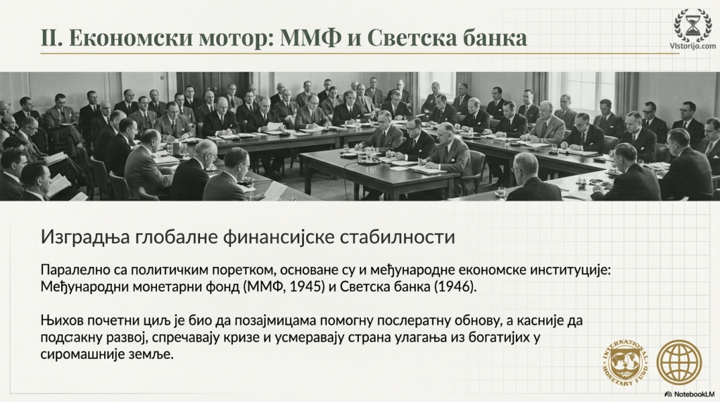 После Другог светског рата основане су и међународне економске институције Међународни монетарни фонд (ММФ, 1945) и Светска банка (1946). Циљ им је био да позајмицама најпре помогну послератну обнову, а после подстакну развој и спречавају кризе. Усмеравали су страна улагања из богатијих земаља у сиромашније земље у развоју.
