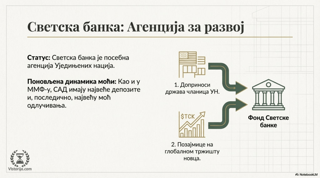 Светска банка је посебна агенција УН. Њен фонд пуне државе чланице УН, али и позајмице на тржишту новца. И у Светској банци и у ММФ највеће депозите имају САД (у ММФ чак 30%), па на основу тога имају и сразмерно велику моћ одлучивања.