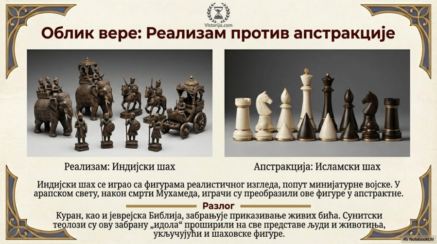 „Иако су муслимани били очарани игром, шаховске гарнитуре с фигурама које подсећају на људска бића и животиње изазивале су сумњу, вероватно због једног одломка из Курана који гласи: ,,Верници, вино и игре на срећу, идоли и божанске стреле су гнусобе које је измислио сатана. Избегавајте их тако да можете напредовати.” Сунитски муслимански теолози укључили су у ову забрану о „идолима“ све представе људи и животиња, и у сликарству, и вајарству, али и шаховских фигура. Шиити сужавају ово тумачење, ограничавајући га само на религијске идоле.