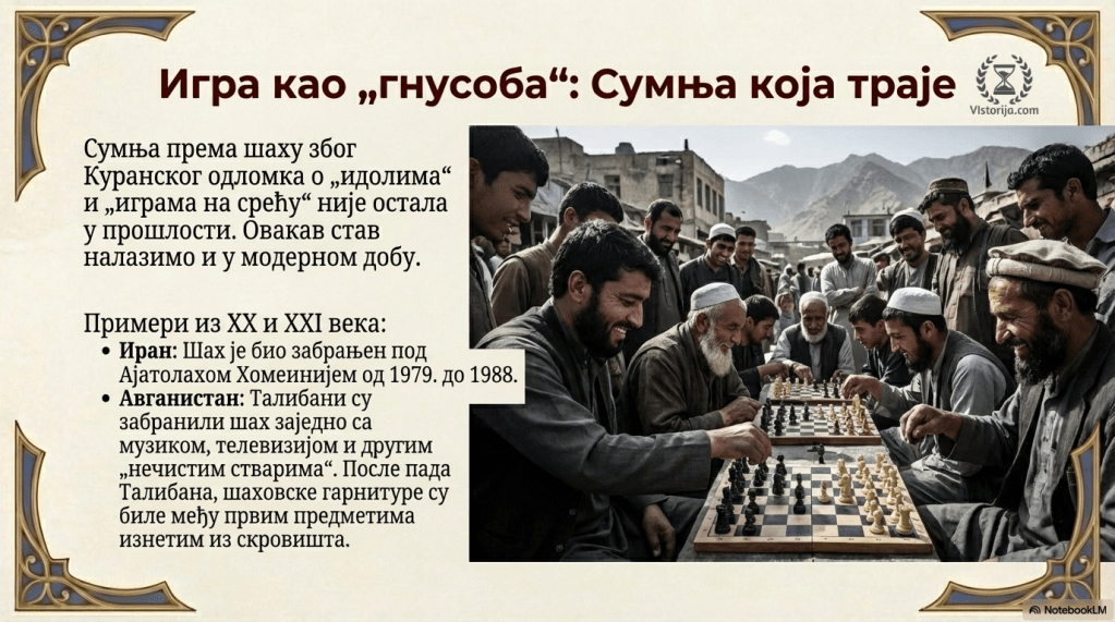 Овакав екстремни став налазимо и у последњим деценијама XX века под Aјатолахом Хомеинијем у Ирану, где је шах био забрањен од 1979. до 1988. године, као и код Талибана у Авганистану, који су шах груписали сa филмовима, телевизијом, алкохолом, лаком за нокте, дечијим змајевима, билијаром, петардама и световном музиком. Авганистанци који су уживали у овим „нечистим стварима“ били су бичевани и затварани. Не изненађује што су у Авганистану, када је ослобођен од Талибана, први предмети изнети из скровитих места били радио-апарати, музички инструменти и шаховске гарнитуре.