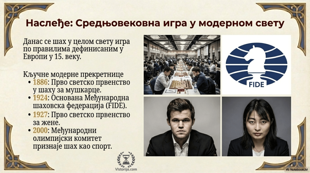 Данас се шах игра по правилима дефинисаним у 15. веку у Европи. Међународна шаховска федерација (FIDE) основана је 1924. године. Шах је као спорт признат од Међународног олимпијског комитета 2000. године. Светска првенства у шаху одржавају се за мушкарце од 1886. године, а за жене од 1927. године.