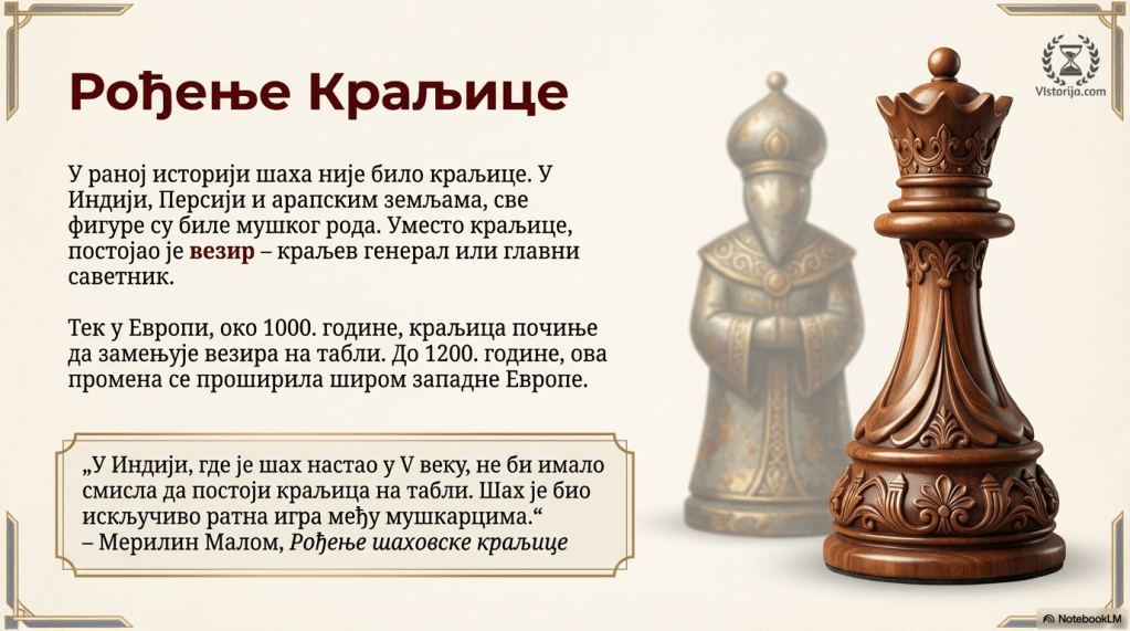 „У раној историји шаховске игре није уопште било краљице на шаховској табли. У Индији, Персији и арапским земљама где се игра зачела све људске фигуре биле су мушког рода. Фигуре су биле краљ, његов генерал или главни саветник, који се звао везир, и редови пешадинаца. Ту су, као и у стварној индијској војсци, борна кола, коњи и слонови. Тек пошто су Арапи окупирали јужну Европу у XIII веку и донели шах, краљица се појавила на табли. Око 1000. године она почиње да замењује везира, а већ око 1200. године могла се наћи широм западне Европе, од Италије, до Норвешке.“