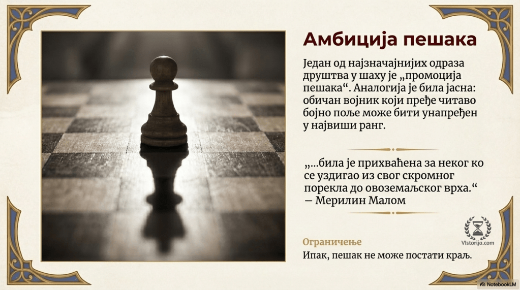 Аналогија с пионом, који би био унапређен у ранг везира одмах пошто би прешао шаховску таблу (у данашњем речнику „промоција пиона“ или „пион враћа краљицу“), била је прихваћена за неког ко се уздигао из свог скромног порекла до овоземаљског врха.