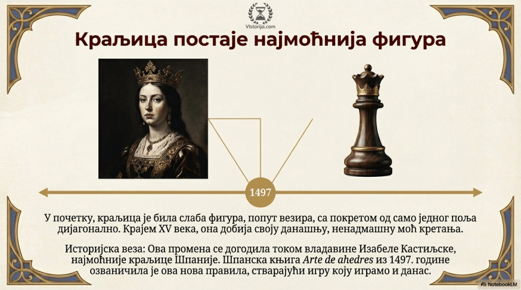 Сасвим је очекивано да је шаховска краљица достигла зенит своје моћи током владавине Изабеле Кастиљске, најзначајније шпанске краљице свих времена.