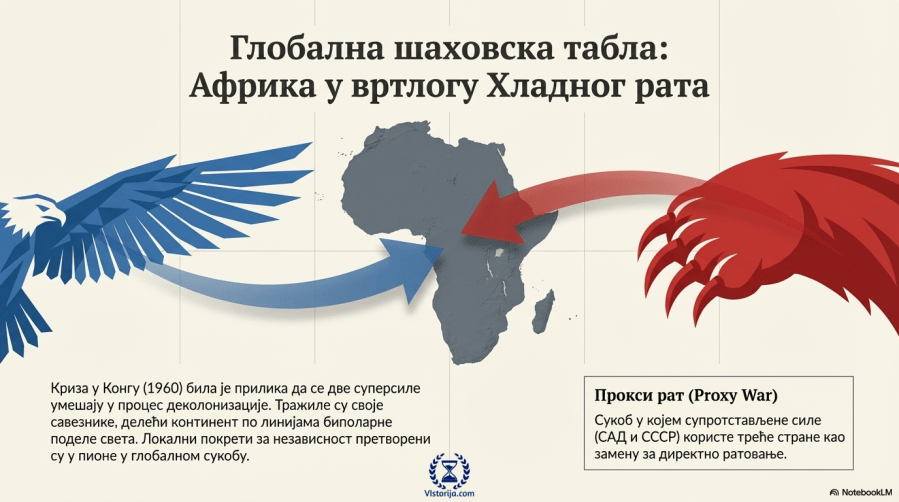 Криза у Конгу је била прилика да се две суперсиле умешају у процес деколонизације Африке и потраже своје савезнике, делећи тако и тај континент по линијама биполарне поделе света. Позив за помоћ двема суперсилама упутио је новопостављени председник владе Патрис Лумумба, покушавајући да угуши сепаратистички покрет у провинцији Катанги, богатој угљем, златом, дијамантима и бакром, који је прогласио независност у односу на централну владу у Леополдвилу. На челу покрета налазио се Моисе Чомбе. Прва помоћ стигла је од мировних трупа УН, али је, на Лумумбин позив, ускоро дошла и подршка СССР-а. Ајзенхауерова [председник САД-а] реакција била је такође брза. Он је тражио свог савезника у грађанском рату, јер није желео да подржи Чомбеа, у страху да би то водило у распарчавање и других афричких држава и довело до хаоса на читавом континенту. Помоћ није желео да пошаље ни Лумумби, кога је Вашингтон видео као човека Москве. На крају је САД војну помоћ послао антикомунистичком команданту конгоанске војске Жозефу ДезиреуМобуту, што је створило и трећу страну у грађанском рату који је отворио врата Хладног рата у Африци. Брзом војном акцијом Мобуто је успео да Лумумбу скине с места премијера и да сам дође на ту позицију. Лумумбу су Мобутове јединице убиле средином јануара 1961, што је од њега направило симбол слободе за многе народе Африке. И поред Лумумбиног свргавања, на југу земље је успостављена просовјетска влада, која је наставила рат. Током неколико следећих година централна Мобутова власт је успела да истисне совјетску зону, као и белгијску, која је подржавала Чомбеа и његову сепаратистичку област са центром у Катанги. У једном тренутку, 1964. године, уз америчку помоћ Чомбе је постао премијер уједињеног Конга, али ни то није донело смирење ситуације. Побуњенички покрети наставили су борбе, а придружио им се и Че Гевара, верујући у могућност револуције. САД су помогле и војни удар и, након четири године рата, 1965, довеле на власт Мобута, који је успоставио контролу над целом земљом и утврдио репресивну власт. Име земље је 1971. променио у Заир, а себе је преименовао у Мобуту Сесе Секо, док је главном граду променио име из Леополдвил у Киншаса, да би земља понела што више афричких симбола и избрисала колонијалну прошлост. Киншаса је тако добила чврстог антикомунистичког владара који је био главни ослонац Запада у Хладном рату. То је значило и да је дошло до значајног заокрета америчке политике и да је насилно наметање својих људи, упркос расположењу у земљи, постало метод којим је био напуштен концепт ширења демократије у свету.“