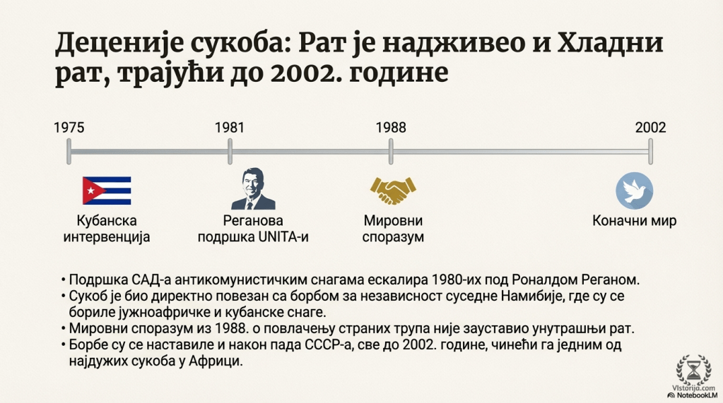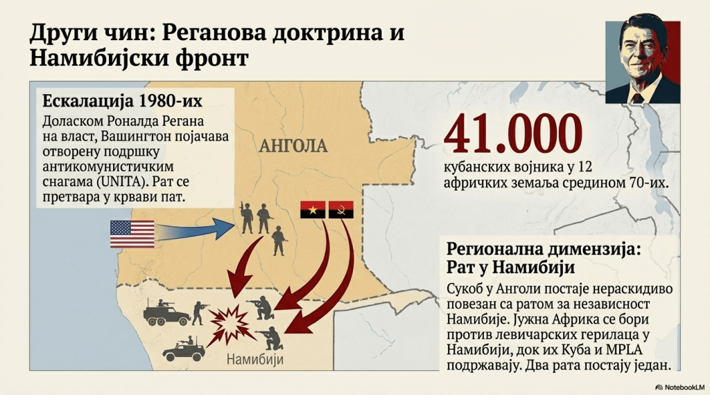 Нову снагу је грађански рат у Анголи добио почетком 80-их, када је у Вашингтону дошао на власт оштро антикомунистички оријентисани Роналд Реган, који није желео да испусти тај „фронт“ и да Совјетима створи прилику за коначну победу у грађанском рату, који је и даље трајао. То је значило нову отворену америчку подршку прозападним круговима у Анголи, што је аутоматски довело до јачања кубанске помоћи супротној групи. Америчко мешање постало је још веће након 1985. када је укинута одредба Конгреса на основу које се САД, убрзо по почетку рата, повукао из Анголе. Америчко-анголски преговори су почели 1987, а од следеће године им се придружила и Куба. Рат се ипак настављао, а сукоби су повезани и са кризом у Намибији [некадашњој немачкој колонији, коју је још током Првог светског рата заузела Јужноафричка република], у којој је крајем 70-их избио рат између суседне Јужноафричке Републике и левичарских герилаца, које су подржавали Кубанци и лево оријентисане групе из Анголе. Од тог времена та два рата су била повезана и на фронтовима и у преговорима. Тако је САД крајем 80-их понудио Кубанцима да за напуштање Анголе буду награђени признавањем независности Намибије. Уз помоћ новог совјетског вође Михаила Горбачова, у Лондону је постигнут споразум да се кубанске снаге повуку из Анголе, а јужноафричке из Намибије. Коначни споразум потписан је 1988, у присуству америчког и совјетског министра спољних послова, Шулца и Шевернадзеа.