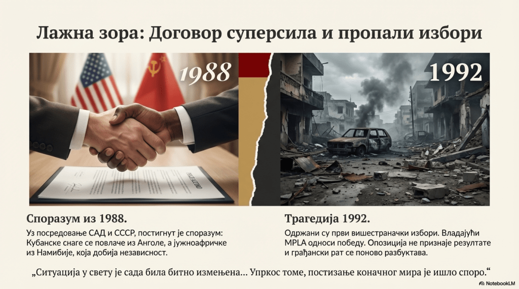 Примена тог споразума у Анголи није ишла лако. Напротив, крајем 1989. године грађански рат се опет разбуктао, што се додатно погоршало после избора који су одржани 1992, а на којима је победу однео леви покрет. Ипак, ситуација у свету је сада била битно измењена. Совјетски Савез је имао своје проблеме, Јужна Африка је демонтирала режим апартхејда, а САД је мир у Анголи преузео као своју одговорност. Упркос томе што су се интереси великих сила променили, постизање коначног мира је ишло споро. Влада националног јединства је, уз подршку Вашингтона направљена 1996, али су се сукоби ипак наставили све до 2002, када су завршени после 28 година рата.“
