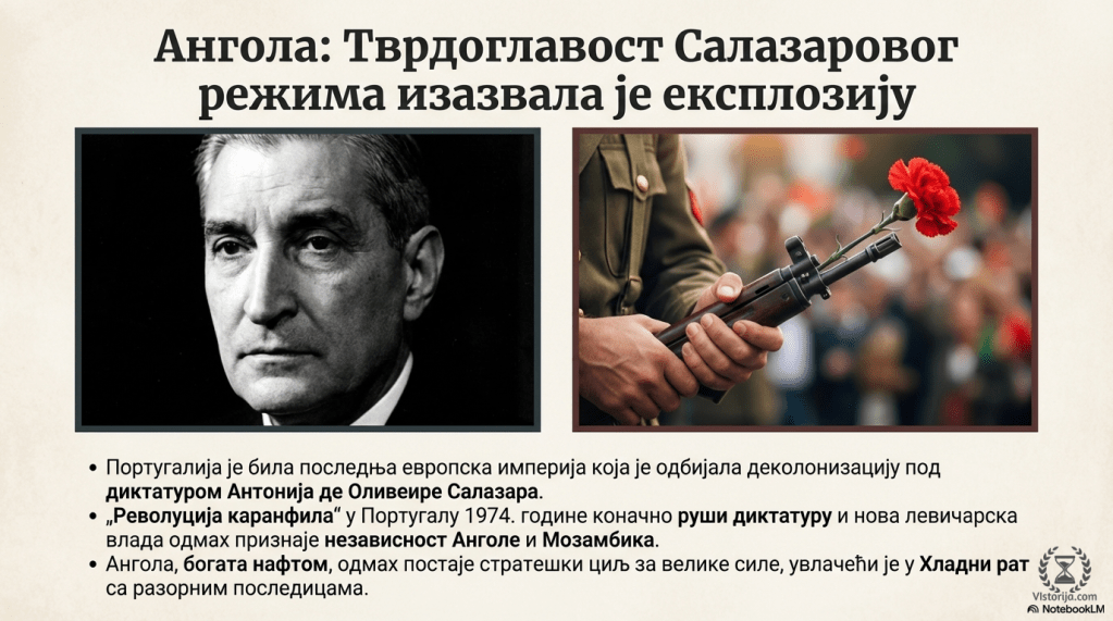 Португалија је била последња европска империја која је пристала на независност својих колонија, јер је њоме деценијама после Другог светског рата владао најдуговечнији диктатор у Европи XX века, Антонио де Оливеира Салазар, који је на власт дошао још 1932. године (годину дана пре Хитлера). Он је поседовање колонија сматрао једним од темеља Португалије, иако никада није посетио ниједну од њих.