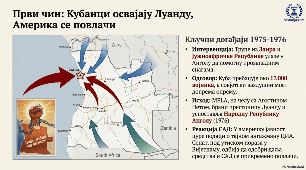 Ангола је била подељена: север је био под контролом прозападних снага, а југ под утицајем комуниста. Кад су трупе из Заира ушле да помогну прозападним снагама, придружила им се и Јужноафричка Република, чиме је локални анголски сукоб добио и регионални значај. Куба је пребацила бројну војску, од око 17.000 војника, а совјетски ваздушни мост је такође помогао да Агостино Нето одбрани престоницу и задржи је под својом, дакле комунистичком контролом. Из читавог сукоба Кина се постепено повлачила, посебно зато што би јој, макар и посредно, савезништво са Јужном Африком умањило углед пред афричким нацијама, где је имала важне интересе. На то су у америчку јавност процурели подаци о тајном ангажману те силе у анголском рату, па је бурна реакција довела до тога да је Сенат, још увек под утиском вијетнамског пораза, одбио да одобри додатна средства за даље америчке акције.