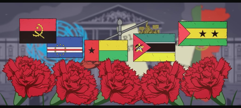 „После четрдесет две године, 1974, четири године након Салазарове смрти, пала је диктатура у Португалу [Револуцијакаранфила]. Нова, левичарска влада је одмах признала независност дотадашњих португалских колонија, Мозамбика и Анголе, које су од раније имале националне покрете. [Прве побуне десиле су 1961. године, када је Португалија изгубила Гоу од Индије, тек 14 година старе државе, након пола миленијума контроле над тим поседом]. Покрет у Мозамбику уживао је подршку Кине [у којој је Португалија задржала Макао до краја века], па се САД, ради очувања добрих односа с том великом силом, није мешао у те догађаје.