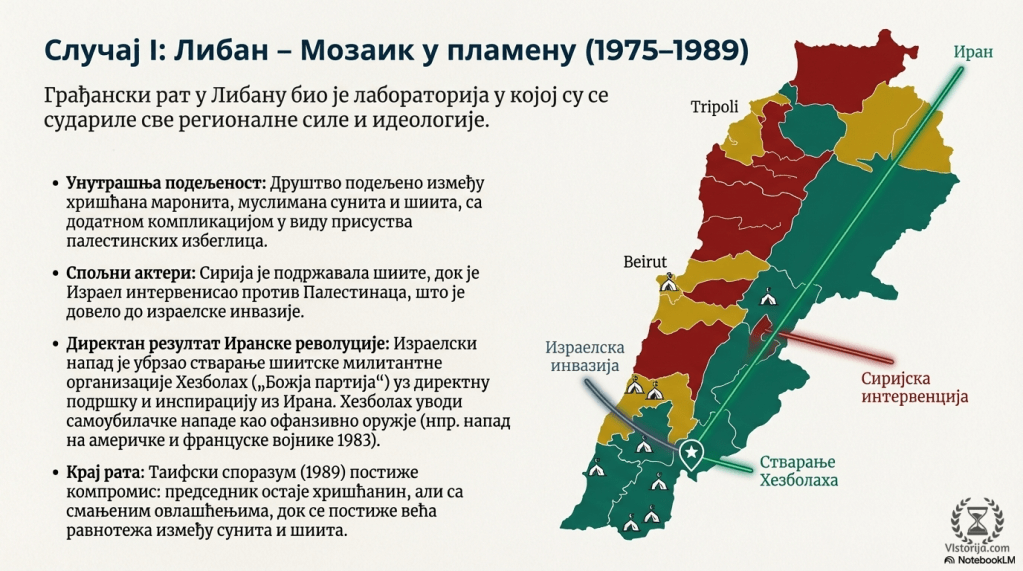 Грађански рат у Либану трајао је од 1975. до 1989. године. Либанско друштво је подељено између хришћана (католика маронита) и муслимана, који су подељени на шиите и суните. Ситуацију је закомпликовало присуство палестинских избеглица у време сукоба Арапа са Јеврејима.
