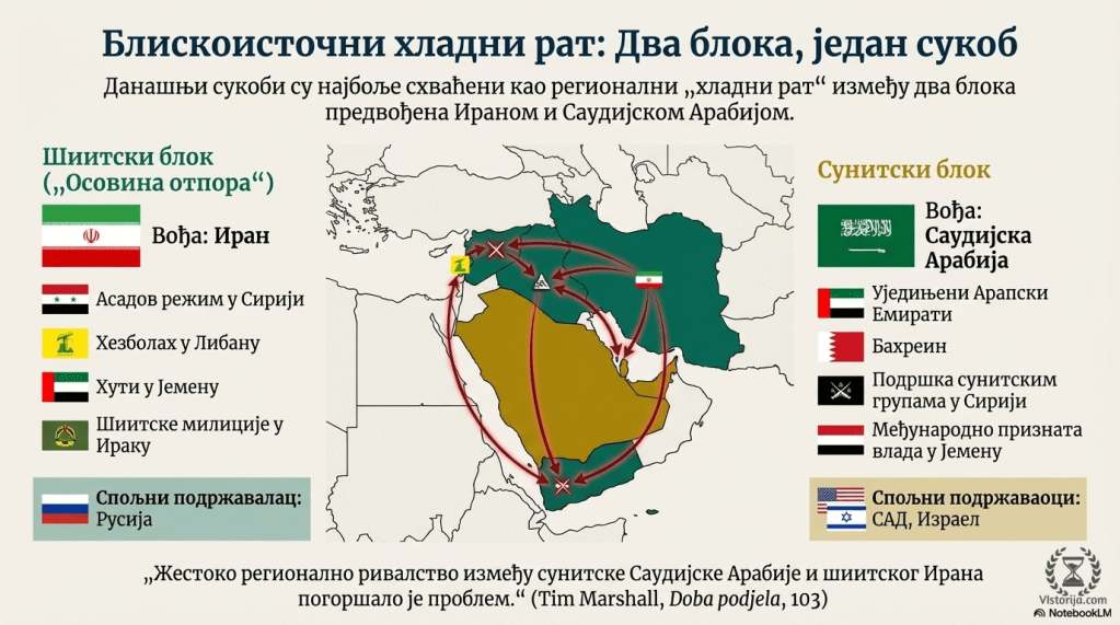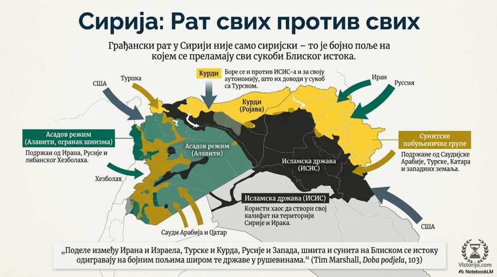„У Сирији је дошло до подела на више етничких и секташких скупина: сунити, шиити, алавити, Курди, хришћани, друзи и други. Отац председника Асада, Хафез, земљу је ујединио под жестоком секуларном диктатуром, али с порастом насиља 2011. године ти су окови брзо збачени. Грађански рат у Сирији један је од најнасилнијих и најкомпликованијих сукоба у свету, у који је укључено више учесника. Сиријски је рат почео као устанак против председника Асада, али већ 2013. године постао је рат за страни утицај на том подручју. Иран подржава Асадов режим, док Саудијска Арабија стоји иза неких од сунитских побуњеничких група. Исламска држава и овде је имала пресудан утицај, премда је до краја 2017. изгубила готово сву територију коју је дотад освојила у Сирији и Ираку. До краја 2018. укључили су се Русија, Иран, Уједињено Краљевство, Француска, Саудијска Арабија, Уједињени Арапски Емирати, Турска, Израел, Хезболах и остали. Поделе између Ирана и Израела, Турске и Курда, Русије и Запада, шиита и сунита на Блиском се истоку одигравају на бојним пољима широм те државе у рушевинама. Све су стране чиниле грозна злодела; власт је чак била оптужена за коришћење хемијског оружја против властитога народа. У земљи су расељени милиони људи, а милиони су и избегли у иностранство.“