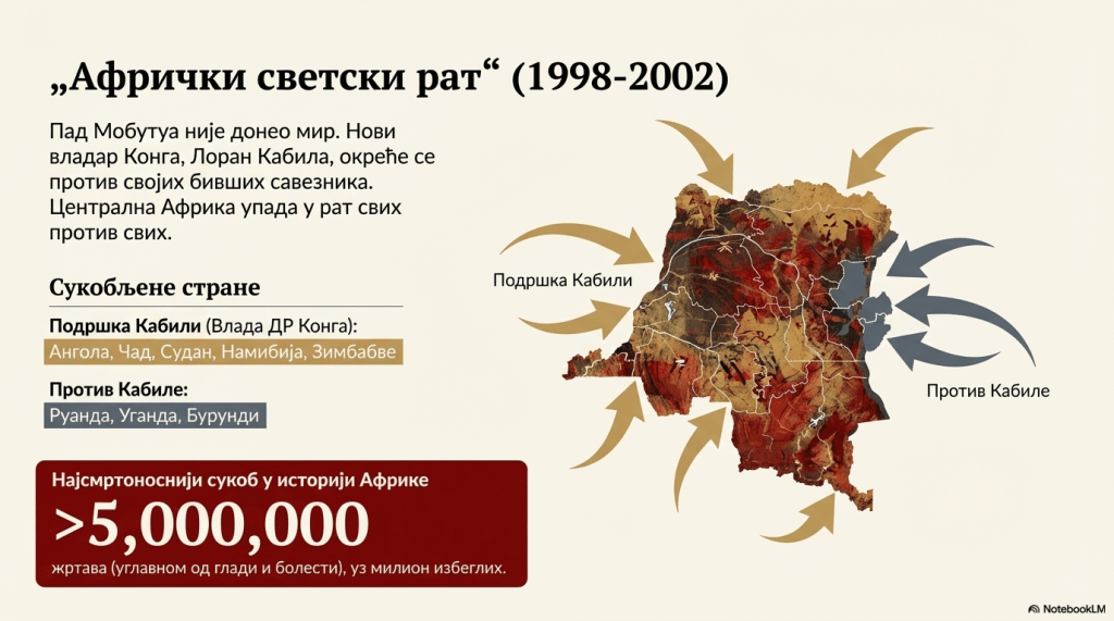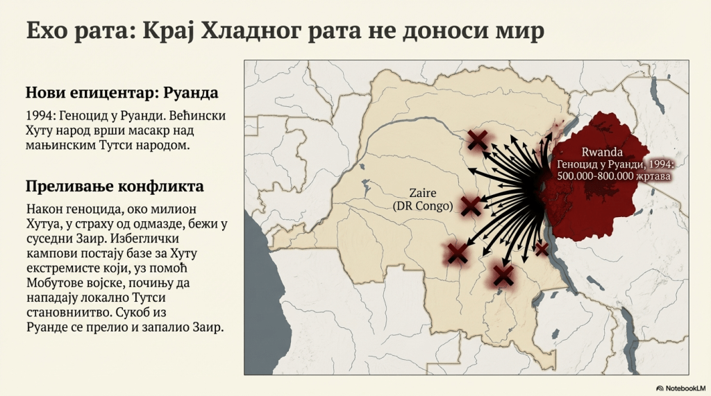 „Тако се сукоб из Руанде прелио на Заир, јер су Хуту избеглице, уз помоћ заирске војске, почеле да нападају заирске Тутсије. Сукоби су ескалирали у јесен 1996, а убрзо се умешала и суседна Руанда. Циљ власти у Руанди, коју су тада, након геноцида, држали Тутси, био је да смене Мобутуа и на власт доведу новог лидера који би се борио против Хуту избеглица и који би заштитио заирске Тутсије. У јеку сукоба, већ оболели Мобуту је побегао у Мароко, што је био крај његове 32-годишње диктатуре у Киншаси.