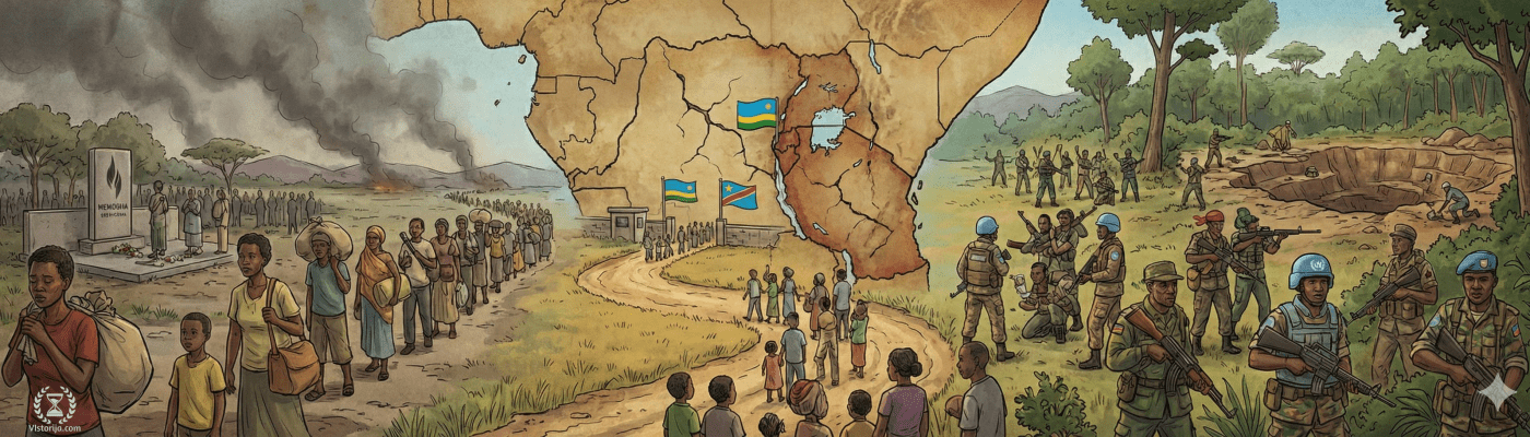Први сукоб између два народа догодио се 1972. године, касније је насиље више пута обнављано, а највеће размере је досегло 1994. године када је дошло до геноцида, односно планираног истребљења народа Тутси од стране Хутуа. Између 500 и 800 хиљада људи је убијено за само два месеца у земљи са свега осам милиона становника. Затим су представници народа Хутуа у страху од одмазде почели масовно да беже у суседни Заир, па их се око милион нашло у избегличким камповима. Парадоксално је да је и сам Заир имао Тутси мањину, а да су се избеглички кампови Хутуа нашли баш у подручјима где су они живели.