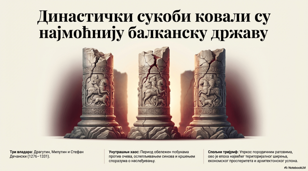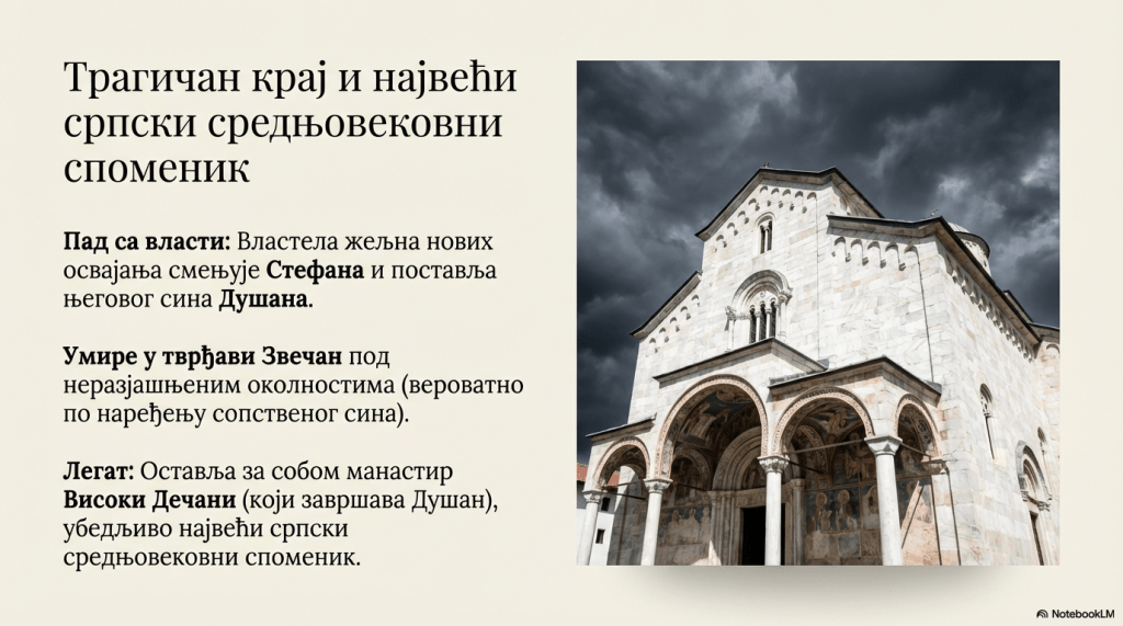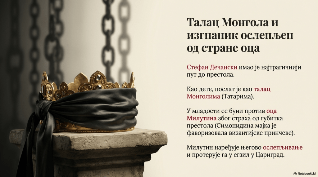 Стефан Дечански (1321-1331) се сматра најтрагичнијим од свих српских владара из династије Немањића. Слат је као талац, у детињству Монголима (Татарима) који су владали Бугарима, а у младости у Цариград, након што је ослепљен (касније ће се испоставити не у потпуности, ако је уопште слуга и извршио наређење, што је он представио као да му је Свети Никола вратио вид) јер се побунио против власти оца (Милутина који није имао деце у браку са Симонидом, па је њена мајка планирала да је наследе браћа из Византије). Престо је ипак наследио поразивши брата од стрица Владислава (Драгутиновог сина) и млађег брата Константина (којег је њихов отац Милутин планирао за наследника), чије убиство је наредио. Живот му је окончан након што га је син затворио у тврђаву Звечан, где је умро под неразјашњеним околностима, што је вероватно еуфемизам за сумњу да је убиство наредио његов син Душан.