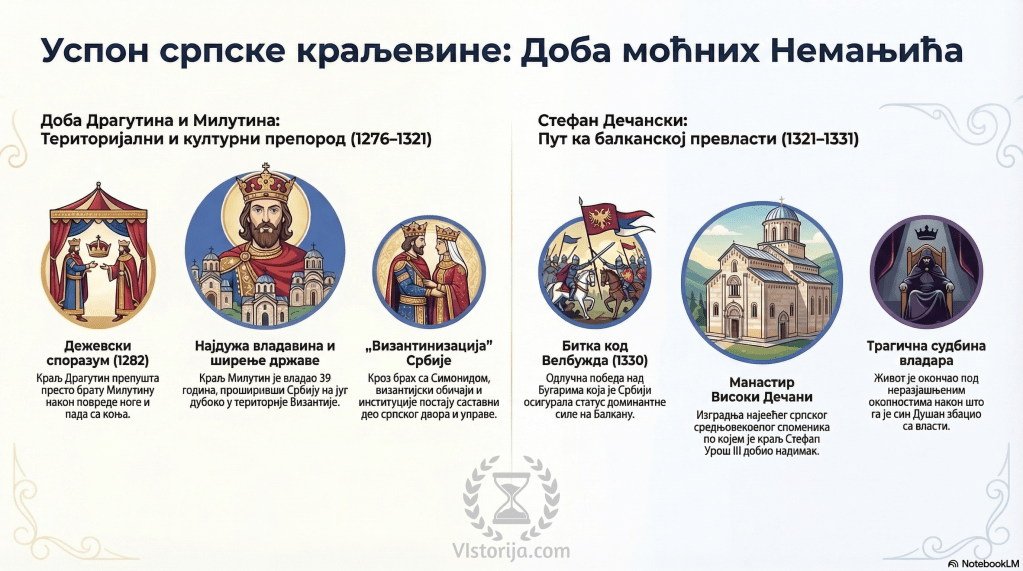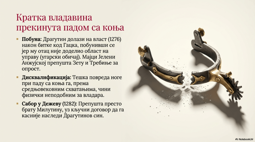 Након краља Радослава, Србијом је од Немањића најкраће владао краљ Драгутин (1276-1282). Повукао се са власти након повреде ноге услед пада са коња, јер га је по средњовековним схватањима такав физички недостатак дисквалификовао као владара. Престо је препустио брату Милутину на државном сабору у Дежеву (код Раса), уз договор да Милутина наследи Драгутинов син. У почетку је Драгутин сарађивао са братом у освајачким походима, али су се касније сукобљавали око власти, мирили, па се опет сукобљавали њихови синови, јер је Милутин временом одустао од договора око наслеђивања.