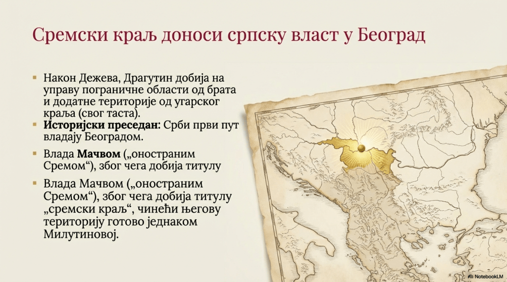 Драгутин је на власт дошао након што се побунио против оца (битка код Гацка) јер му као престолонаследнику није одредио неку област да њоме управља, што је био обичај у Угарској, чијег краља је Драгутин био зет, јер га је отац оженио мађарском принцезом. После преузимања власти, Драгутин је препустио област Зете и Требиња мајци Јелени Анжујској, која је тим територијама управљала самостално, а заузврат сину дала опрост за свргавање оца са престола. После силаска са престола и договора у Дежеву, Драгутин је од Милутина добио на управу област уз границу са Угарском. Она је додатно увећана територијама које је добио од угарског краља, међу којима је био и Београд, којим су Срби тако први пут завладали. Београд је током средњег века углавном био погранични град под влашћу Мађара, у раном средњем веку и Византије, а у два наврата и Бугара, током чије власти у IX веку се Београд први пут спомиње под тим именом (други пут бугарски је био 1230-1232). Та Драгутинова област је била само мало мања од Милутинове. Називан је „сремски краљ“, иако тада више није био краљ, а није ни владао Сремом, него Мачвом, која је називана „оностраним Сремом“, јер је исто била равничарска област са друге стране Саве. Када је Милутин покушао да преотме Драгутинове територије од његовог сина наследника, мађарски краљ је узео назад Београд и Мачву.