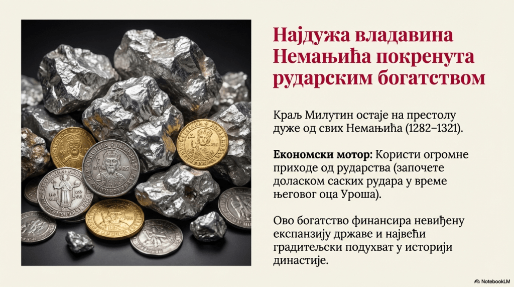 Супротно свом претходнику, краљ Милутин је на престолу остао најдуже (1282-1321) од свих Немањића. Искористио је приходе од напретка привреде за време очеве владавине (краљ Урош, који је примио немачке рударе избегле из Угарске од Монгола) за ширење државе и подизање храмова и манастира.