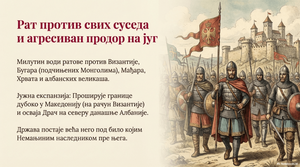 Ратовао је против свих суседа (Византије, Бугара потчињених Монголима, Мађара, Хрвата, а чак су и неки албански великаши учествовали у коалицији против њега) и женио се са принцезама - мађарском, бугарском и византијском (последње две споменуте су биле малолетне, Мађарица је била рођена сестра жене његовог брата, прва жена му је била Српкиња, а друга ћерка византијског великаша из Тесалије). Проширио је српску државу више него иједан Немањин наследник пре њега. Подигао је храмова више него иједан други владар из династије Немањића (рачунајући и оне који су владали после њега), а најзначајнији су Грачаница и Богородица Љевишка.