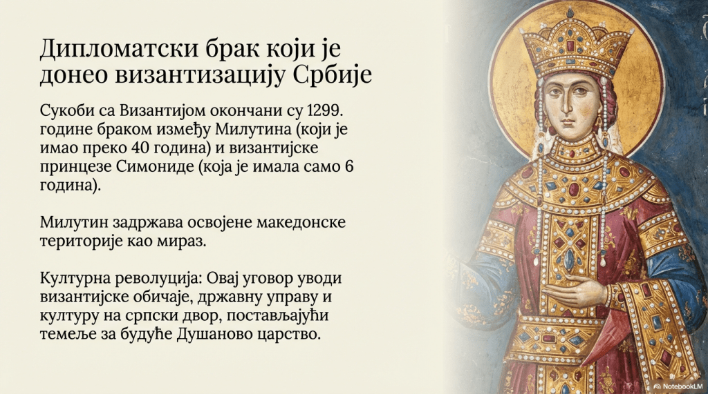 Сукоби са Византијом су на Милутинов предлог окончани његовим браком са византијском принцезом. За ту улогу је била предвиђена царева сестра (удовица), која је одбила понуду, па ју је заменила царева ћерка. Проблем је што је она имала само 6 година, а Милутин, који је у том тренутку (1299) био у четвртом браку, тада је имао више од 40 година и био старији од Симонидиног оца. Захваљујући овом браку Милутин је задржао освојене византијске територије у Македонији, добивши их као мираз. Овим уговором о пријатељству почиње “византизација” Србије, која ће доћи до пуног изражаја у Душановој полугрчкој држави. Византијски обичаји уводе се на српском двору, византијске институције продиру у државну управу, византијска култура делује на читав јавни живот. Србија ће још ратовати против Византије, али ће византијски културни утицај у Србији деловати интензивније што Србија више буде ширила своје границе на рачун Византије и дубље продирала у старе византијске земље.