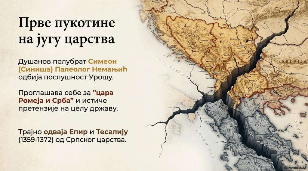 Душанов полубрат Симеон (Синиша) Палеолог Немањић, син Дечанског са другом женом Маријом Палеолог (њена ћерка била је и Јелена Шубић), се прогласио царем Ромеја (Римљана на грчком језику, како су себе називали у Византији) и Срба, истакавши претензије да постане Душанов наследник. Загосподарио је Епиром и Тесалијом (1359-1372) и трајно одвојио те области од Српског царства.