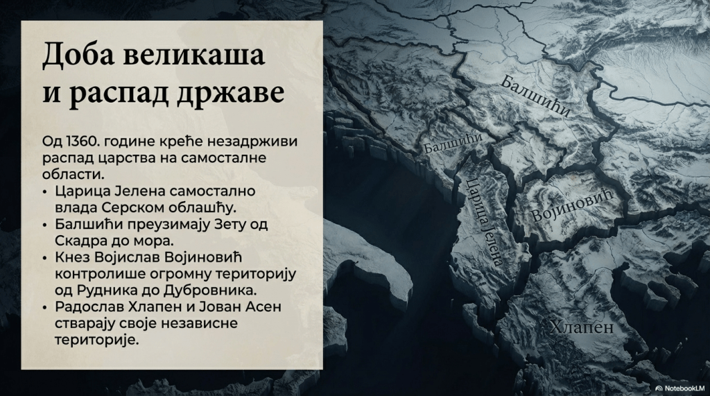 Од 1360. почиње распад царства – српски велможа Радослав Хлапен, господар Бера и Водена, почео је да ствара самосталну област, независну од Уроша, а царица Јелена (Бугарка) почиње самостално да влада Серском облашћу. Њен брат Јован Асен, господар Конине и Валоне, осамосталио се у јужној Албанији. Он је био и очух Симеонове жене. Од 1360. су се осамосталили и Балшићи у Зети, који су управљали малом облашћу од Скадра до мора. На западним границама се већ назирала највећа област, којом је управљао кнез Војислав Војиновић. Он је са братом Алтоманом држао подручје од Рудника и Дрине до Дубровника и Боке Которске. Додуше, кнез Воjислав је пружао пуну подршку Урошу. Утицај и моћ кнеза Војислава је био толики да је самостално ратовао против Дубровника (1358-1362), с намером да поврати Стон и Пељешац. Умро је изненада 1363. године.