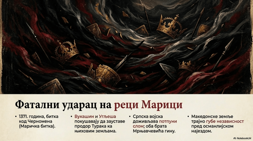 Вукашин планира савез са Дубровником и Балшићима против Николе Алтомановића, чији је продор зауставио, а сад жели и да га порази. Браћа Мрњавчевићи су поражени и погинули 1371. у бици на реци Марици код Черномена, у близини нове турске престонице Једрена. Ту су покушали да зауставе продор Турака ка њиховим земљама. Након те битке македонске земље су изгубиле независност. Вукашин и Угљеша су погинули у бици. Цар Урош је надживео свог савладара око два месеца (супротно томе у епским народним песмама је Вукашин представљен као убица Уроша). Пошто није имао деце, са њиме се угасила династија Немањића, која је више од два века владала Србијом.