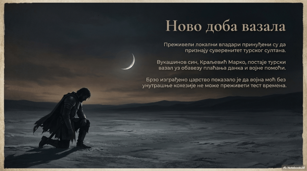 Локални владари, међу њима и Вукашинов син Краљевић Марко, морали су да признају суверенитет турског султана и да му се обавежу на плаћање данка и војну помоћ.