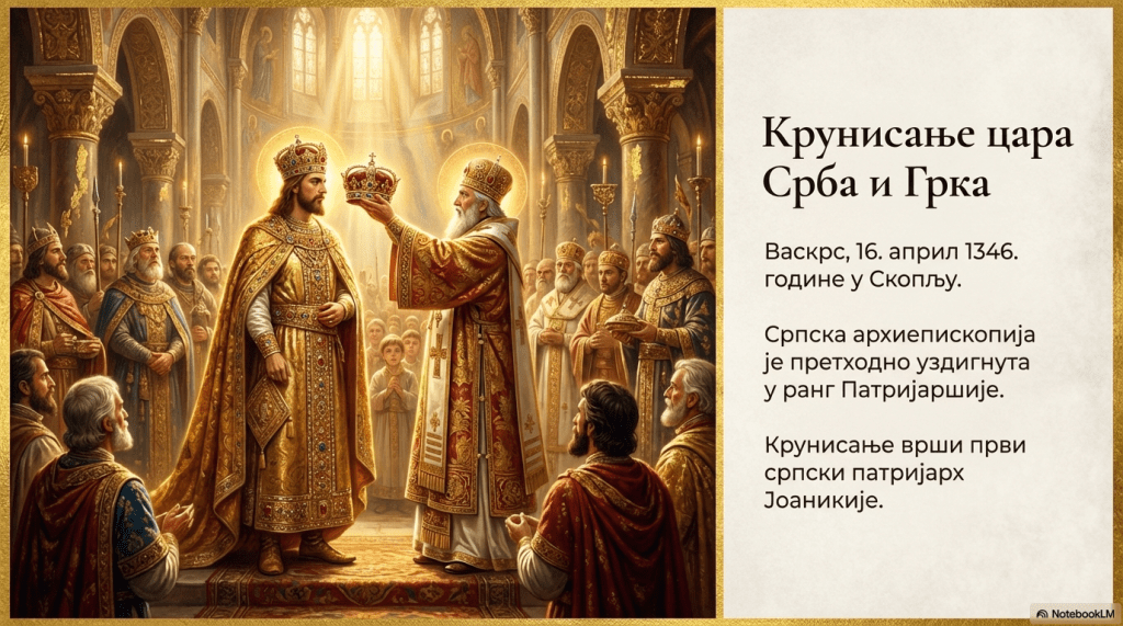 Душан се крунисао за цара Срба и Грка на Васкрс 16. априла 1346. године у Скопљу. Крунисао га је први српски патријарх Јоаникије. У ранг патријаршије Душан је претходно (ради крунисања за цара) уздигао српског архиепископа, уз сагласност бугарског патријарха и охридског архиепископа.