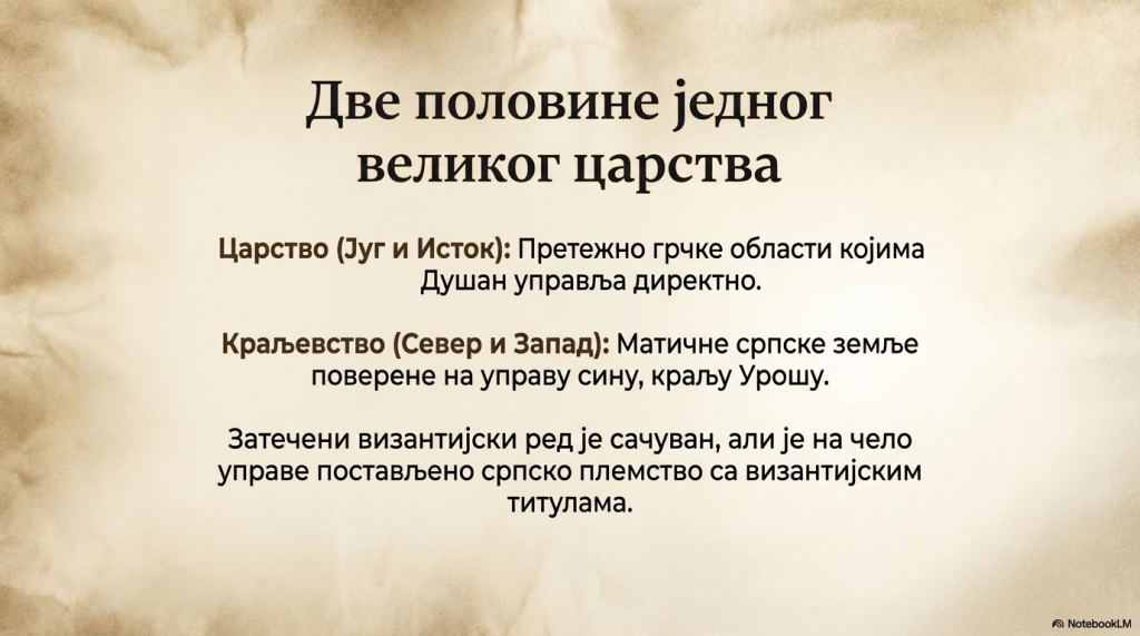 Своју државу Душан је поделио на краљевство северно и западно од Скопља и царство јужно и источно од Скопља. То је било упола грчко царство, које је обухватало многе земље грчке културе и грчког језика, и управо у тим земљама било је тежиште новонастале царевине. Као цар Душан је непосредно управљао јужним, претежно грчким делом свога царства, а управу над матичним српским делом поверио је своме сину, краљу Урошу. У дворским обичајима, уређењу и правном поретку Душаново царство се умногоме угледало на византијске узоре, нарочито у свом јужном, царском делу, али у новоосвојеним грчким областима на челу управе стајали су, одликовани византијским титулама, представници српског племства, Душанови ратни другови, главни добитници његових победничких ратова. Затечен ред је углавном сачуван, али се владајући слој променио.