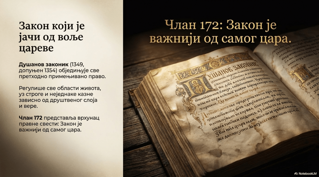 Душанов законик (објављен 1349. године, допуњен 1354. године) представља најзначајнији правни споменик средњовековне Србије, који је објединио све претходно примењивано право. Важио је у целој држави и регулисао све области живота. Прописивао је различите казне – новчане, одузимање стоке, смртна казна, сакаћење (одсецање делова тела и друга мучења) и батинање. Није био равноправан према свим друштвеним групама. Кажњавао је прелазак из православља у католичанство и пропаганду католичанства. Нису били дозвољени бракови припадника различитих вера и друштвених слојева. Признавао је заклетву као доказно средство. Кажњавана је и увреда псовањем другога (чланови 55. и 95). Члан 172. је прописивао да је закон важнији од воље цареве.
