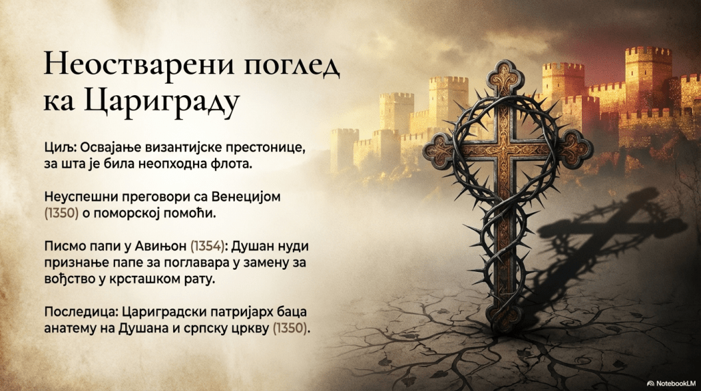 Душан се носио мишљу и да освоји византијску престоницу Цариград. Да би то остварио била му је потребна помоћ са мора, па се обратио Венецији (1350), тада највећој поморској сили. Међутим, она тада није била заинтересована за освајање Цариграда.