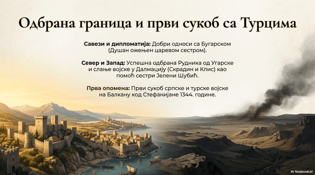 Први сукоб српске и турске војске на Балкану био је у оквиру византијских грађанских ратова, 1344. код Стефанијане у Тракији. Душан је 1354. упутио писмо папи у Авињон, тражећи да га именује предводником у борби против неверника. Заузврат је чак изразио спремност да призна папу за поглавара свих хришћана. To му није било тешко да изјави јер га је нешто раније васељенски (цариградски) патријарх искључио из заједнице православних хришћана (1350) због неканонског проглашења српске патријаршије (анатему ће збацити тек кнез Лазар 1375. године, измиривши се са цариградском патријаршијом). Међутим, од те идеје, осим размене посланстава, ништа није реализовано. Цар Душан је један од ретких владара из династије Немањић (уз Радослава и Урoша I) које Српска православна црква није канонизовала (прогласила за светитеље).