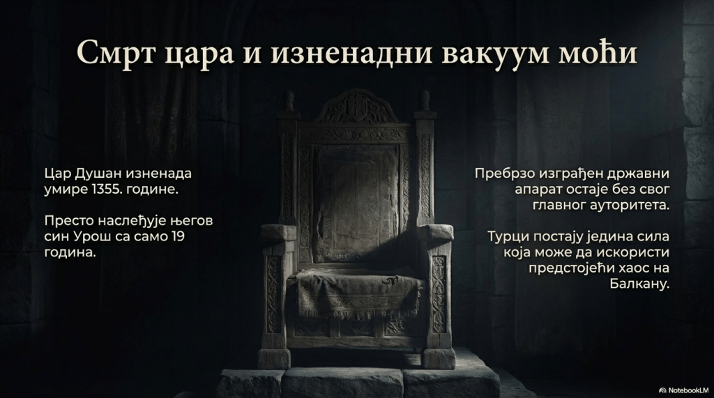 Душанов син Урош је царски престо наследио са 19 година. Царство које је Душан исувише брзо изградио почело је после његове смрти брзо да се распада. Свуда су се на његовим рушевинама дизали мањи самостални или полусамостални владари. Византија је била сувише слаба да искористи распад Душановог царства и поврати своје територије. Корист су извукли Турци, јер више на Балкану није било силе која би могла озбиљно да се супротстави османлијском продирању.
