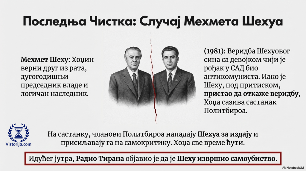 „Године 1981, Хоџа је скупио снагу за још једну, последњу чистку, како би елиминисао свог друга из Другог светског рата и наследника трона, премијера Мехмета Шехуа. Окидач је била веридба Шехуовог сина с девојком из Тиране, чији је рођак, који је живео у Сједињеним Државама, био антикомуниста. Шеху се, под притиском, сложио да откаже веридбу, али Хоџа је сазвао Политбиро, како би се продискутовао овај случај. Чланови Политбироа напали су Шехуа за издају и присилили га на самокритику. Хоџа није говорио. Идућег јутра, Радио Тирана објавио је да је Шеху извршио самоубиство. Очигледно осећајући да му прети смрт – и вероватно надајући се да ће тако поштедети своју породицу – Шеху се убио. Неки кажу – да је био убијен.