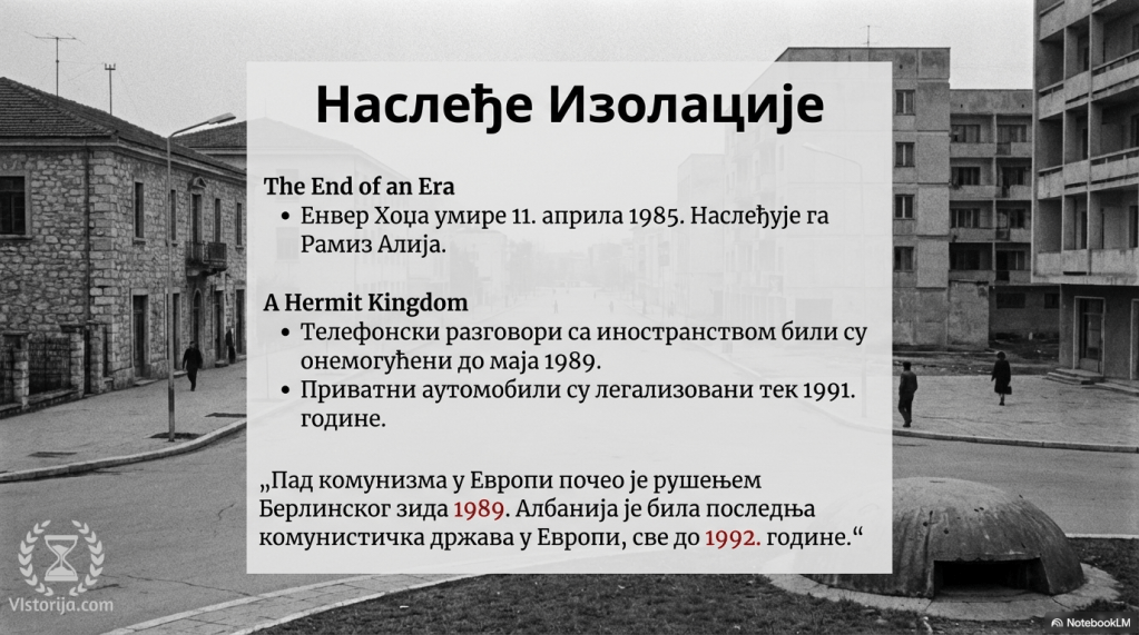 Одлука вође је била да власт уместо његовог пријатеља Мехмета Шехуа наследи његов ученик Рамиз Алија. То се десило након смрти Енвера Хоџе 11. априла 1985. године. Албанија је остала изолована земља. Од доласка на власт комуниста после Другог светског рата, Албанцима су били онемогућени телефонски разговори са иностранством све до маја 1989. године. Приватни аутомобили су легализовани 1991. године. Пад комунизма у Европи је почео рушењем Берлинског зида и распадом СССР-а. Албанија је била последња комунистичка држава у Европи до 1992. године.