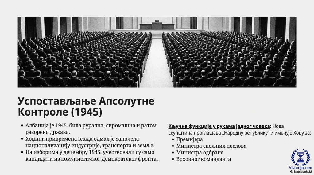 Албанија је 1945. годину дочекала као рурална, сиромашна и ратом разорена држава. Привремена влада, с Хоџом на челу, почела је да национализује индустрију, транспорт и земљу. На изборима за скупштину у децембру 1945. учествовали су само кандидати из комунистичког Демократског фронта. Нова скупштина прогласила је ,,Народну републику“ и поставила Хоџу за премијера, министра спољних послова, министра одбране и врховног команданта.“
