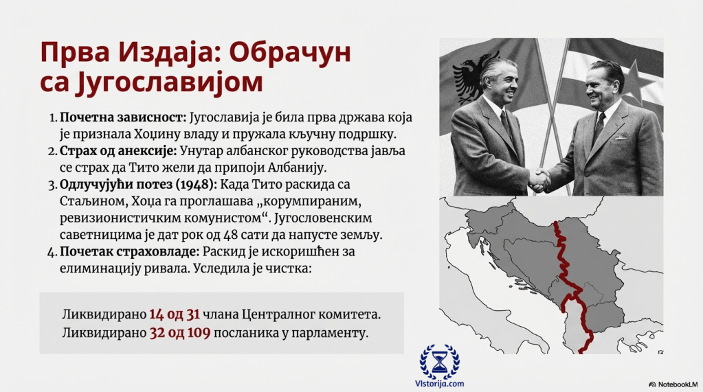 „У исто време, дошло је до подела у Албанији у вези са обимом југословенске контроле. Неки су се залагали за још чвршће везе, међутим, остали су страховали да ће Тито анектирати њихову малу и рањиву државу. Хоџа је у тој дебати остао неутралан, али је онда направио одлучујући потез. Када је Тито прекинуо односе са Совјетским Савезом 1948, Хоџа је прогласио југословенског вођу за корумпираног, ревизионистичког комунисту, који је издао марксистичке идеале. Југословенским саветницима дао је рок од четрдесет осам сати да напусте земљу.