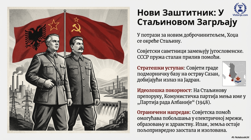 У потрази за новим доброчинитељем, Хоџа се обратио Стаљину. Совјетски саветници заменили су југословенске, а СССР је понудио сталан прилив помоћи. Совјети су изградили подморничку базу на острву Сазан, у близини албанске обале на југу, чиме су добили стратешку тачку на Јадранском мору. На првом конгресу албанске Комунистичке партије, одржаном у новембру 1948, по Стаљиновој препоруци, делегати су променили име партије у Партија рада Албаније. Совјетска помоћ омогућила је да Хоџа побољша електричну мрежу, образовање и здравство. Неписменост и смртност деце је опала. Ипак, земља је остала пољопривредно заостала, занемарена и удаљена.