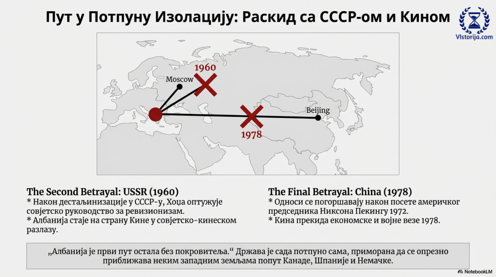 Спољнополитички ослонац Енвер Хоџа је поново променио 1960. године, када је након разлаза СССР-а и Кине опет стао на страну удаљеније државе. Међутим, односи Албаније и Кине су се погоршали након посете председника САД-а Пекингу 1972. године, а шест година касније Кина је прекинула економске и војне везе. Албанија је први пут остала без покровитеља. Неразвијеној Албанији је била неопходна економска и војна помоћ, па се Енвер Хоџа опрезно приближавао западним земљама које су му биле по вољи, као што су биле Канада, Шпанија и Немачка.