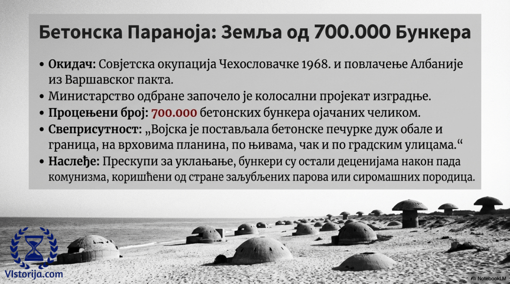 „Након совјетске окупације Чехословачке 1968, Хоџа се повукао из Варшавског пакта, иако Албанија годинама није присуствовала заседањима ове организације. Министарство одбране отпочело је колосални пројекат изградње, колико се процењује, седамсто хиљада бетонских бункера, ојачаних челичном конструкцијом. Војска је постављала бетонске печурке дуж обале и граница, на врховима планина, по њивама, чак и по градским улицама. На барикадама су штрчали копљасти врхови како би ометали падобранце. Исувише скупи за уклањање, бункери су остали годинама након пада комунизма. Посећивали су их љубавни парови, а сиромашне породице користиле су их уместо крова над главом. Сељаци којима је враћена национализована имовина причали су колико бункера су добили.“