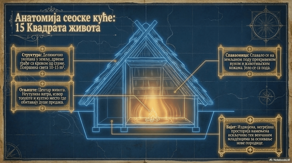 Центар куће било је огњиште на коме се ватра ретко гасила. Ватра са огњишта била је извор топлоте и светлости. Огњиште је имало и култно значење. Веровало се да ту обитава душа предака чувајући дом потомака. У примитивнијим сеоским заједницама јело се са пода, а у већим кућама су постојале столичице. Спавало се на поду прекривеном вуном. Током спавања су се покривали животињским кожама и крзнима. Тек ожењени члан домаћинства је стицао привилегију да се са својом невестом исели из пренасељене куће, која је била колективна спаваоница, и пређе на починак у вајат, у којем се није ложила ватра. То је била оаза приватности, где се зачињала нова породица, рађањем потомства.