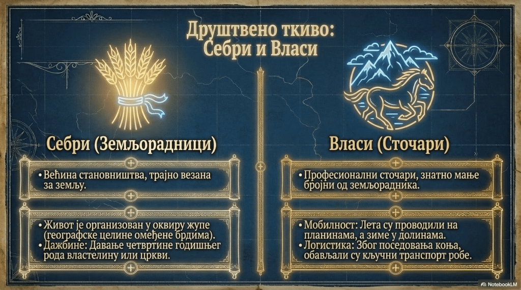 Становници села су у социјалном погледу обично били подређени земљишном поседнику – властелину или цркви. Четвртину годишњег рода давали су поседнику земље, а преостали део је остајао за прехрану породице.