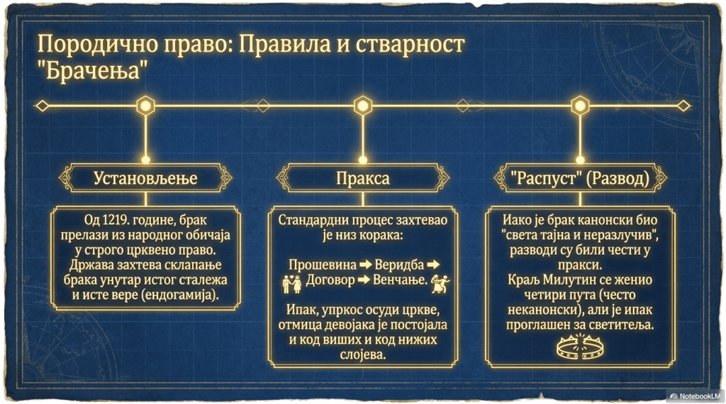 „Примањем хришћанства у 9. веку, а нарочито од оснивања Српске архиепископије (1219), са Савом Немањићем на челу, брак је из области народног обичајног права прешао у црквено право. […]
