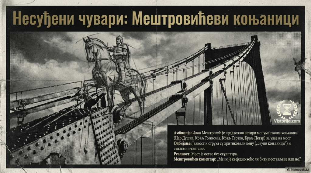 Земунски мост је одличан објект и без г. Мештровићевих „Коњаника“. У данашњим тешким привредним приликама готово је неупутно утући 20,000.000 динара за украс такве врсте, поготово кад се зна да би се тих двадесет милиона динара могло корисно употребити на друге сврхе.