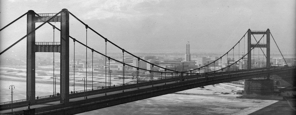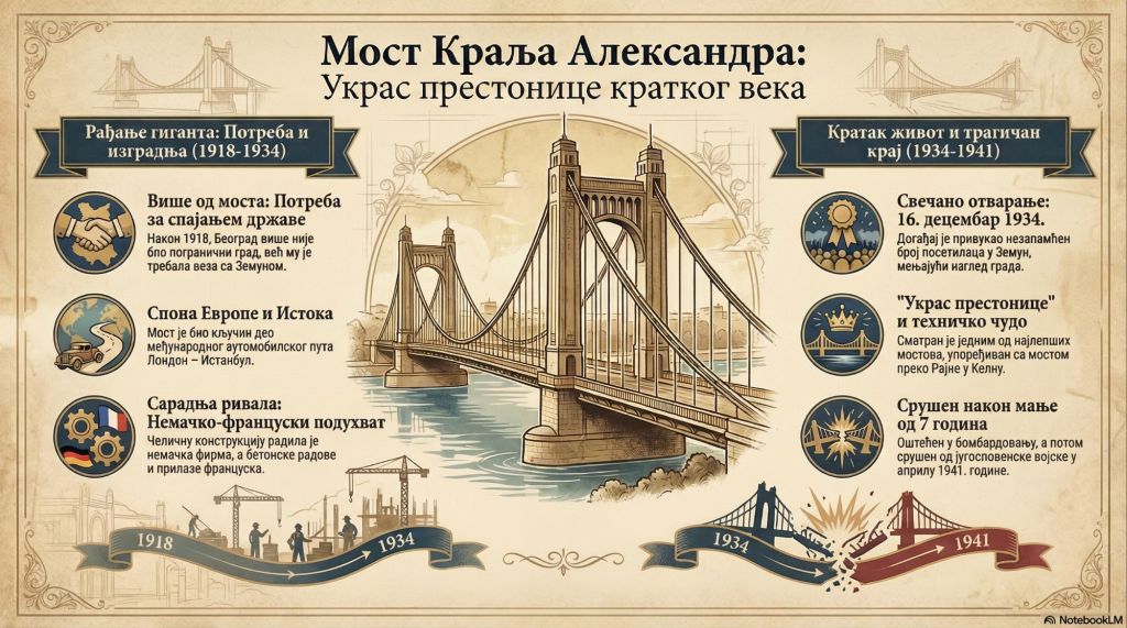 „Александров мост је, први пут у историји, успоставио трајну копчу, поништавајући онај најдубљи, вековни, исконски раскол између светова. Цивилизацијска вододелница код Београда претворена је у симбол цивилизацијског спајања. Претходно је река Сава била премошћивана више пута, и од Бечлија и од Османлија, али увек привременим пловећим понтонима, како би освајачке војске из Европе или Азије наставиле своје походе ка супарнику на једном или другом континенту. Изградња моста започета је 1930, у партнерству немачке и француске градитељске компаније. За архитектонски узор узет је Милхајмски мост преко Рајне у Келну из 1929. Изведен у техници натегнуте челичне ужади, Александров мост је, у оригиналу, био дугачак безмало пола километра. На обе обале, на самим рубовима висеће конструкције, налазила су се четвртаста одморишта с каменим степеништем до самог подножја. […] С обзиром на околност да је војвођанска страна још била углавном мочварна и пуста, сврха моста била је да се Београд повеже са Земуном и старим бежанијским аеродромом. У самом центру Земуна била је смештена и команда Југословенског ратног ваздухопловства.“