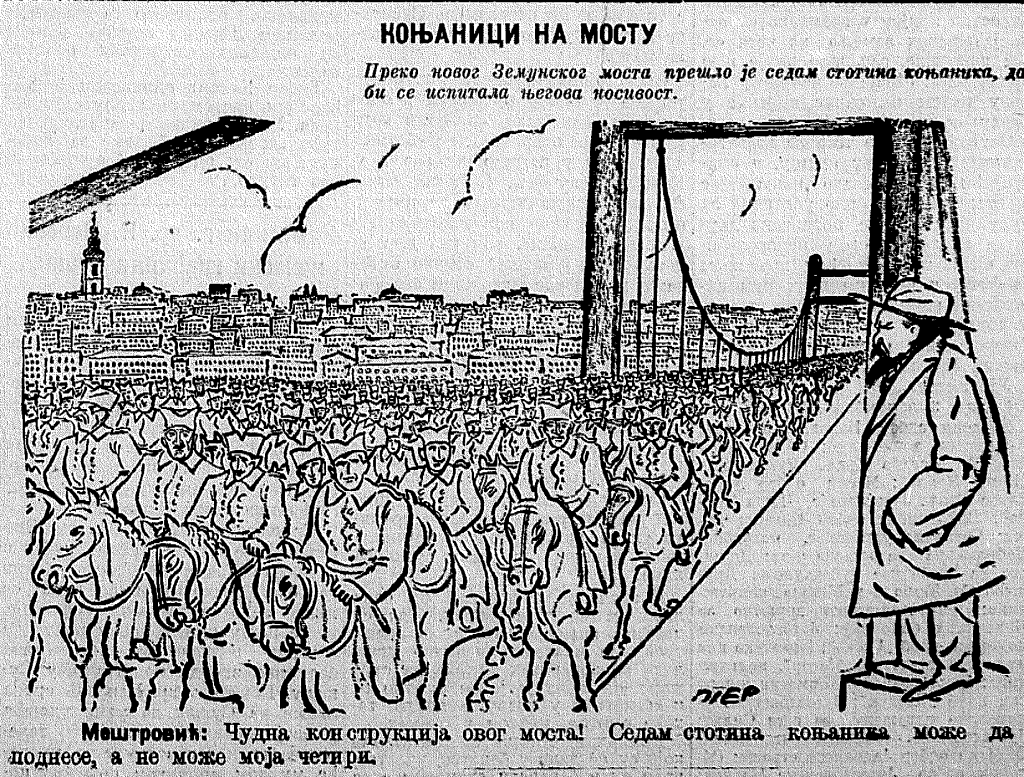 Крајем овог месеца, приликом пробног оптерећења, преко новог Земунског моста краља Александра проћи ће 12 тешких теретних аутомобила и 800 коњаника, Правда, 3.11.1934, 5.