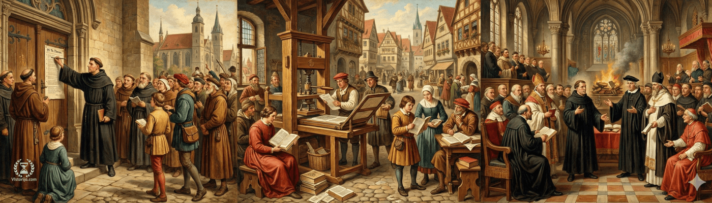 Када се 1517. године супротставио опроштајницама грехова, Лутер је уочио нападну замену хришћанске вере религијским обредом и позвао је на расправу о томе. Изопштен је из католичке цркве 1520. године, због јеретичког учења које је одступало од утврђене вере. Покренуо је реформу цркве. Лутер и његови следбеници су истицали да између човека и Бога није потребно да постоји посредник. Веровали су да сваки писмени човек може сам да тумачи прочитано из Библије, па су њихови свештеници уместо да обављају црквене обреде (којима нису придавали значај) постали проповедници хришћанског учења (попут апостола) онима који нису знали да читају Јеванђеља, на којима се вера заснивала. Свештеницима је дозвољено да се жене, што у оквиру католичке цркве нису могли.