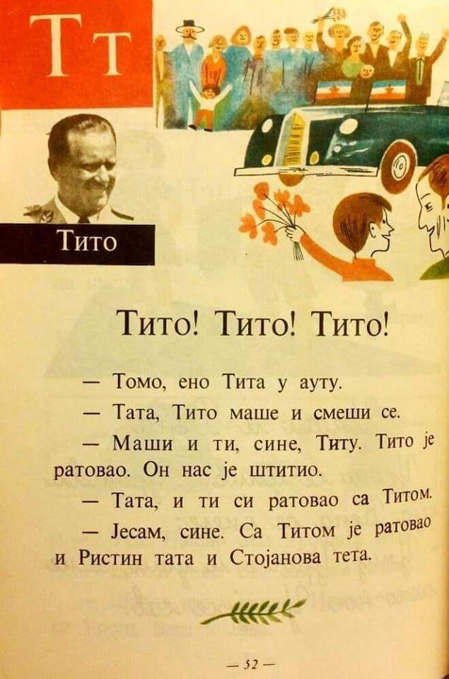 „У социјалистичкој Југославији, велика пажња посвећивана је васпитавају младих у духу комунизма и неговању традиција Народноослободилачке борбе (НОБ-а) у најразличитијим формама, од политизовања образовања, до програмирања слободног времена. Сви ученици су, већ у првом разреду основне школе, на Дан републике, не савладавши ни сва слова, постајали чланови пионирске организације, уз ритуално полагање Пионирске заклетве и добијање пионирских књижица које су биле црвене боје, као и партијске. Симболи југословенске стварности, Тито, Партија, партизани и револуција, били су присутни у називима школа, у уџбеницима, лектири, наставним плановима и програмима… О идеологизацији детињства сведочи и чињеница да је, на пример, у буквару слово М симболисала мама, али је слово Т често симболисао Тито, а не тата. Генерално, култ Тита био је присутан у различитим сегментима детињства, што се види и по писању дечије штампе, И екскурзије су имале јак идеолошки печат, па се најчешће путовало „стазама братства и јединства“, или „стазама револуције“ – у Титово родно место Кумровец, али и у Јајце, Јасеновац, на Сутјеску, Козару, Кадињачу… Нераскидиве везе између деце и тековина НОБ-а под вођством партизанског покрета наглашаване су у свакој прилици. Погледи најмлађих на свет, који су, по правилу, специфични и испуњени знатижељом и истраживачким духом, тако су усклађивани и изједначавани са строго уоквиреним погледима одраслих, тачније власти.“